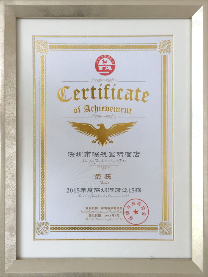 在随后的颁奖盛典上,深圳深航国际酒店凭借持续的创新管理与服务、良好的客户口碑,一举斩获2015年度“深圳酒店业15强”称号。